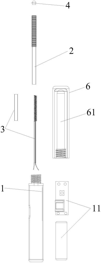 29、本实用新型的有益效果在于,通过第一发热部、第二发热部配合设置,可用于共同发热,以实现金属睫毛刷在刷睫毛时具有加热功能,而基于第一绝缘管的作用,以避免第一发热部、第二发热部接触而导致出现短路,基于第二绝缘管的作用,以避免第二发热部与金属刷头接触而导致出现短路,使得该金属睫毛刷在进行使用时,其可靠性更高。