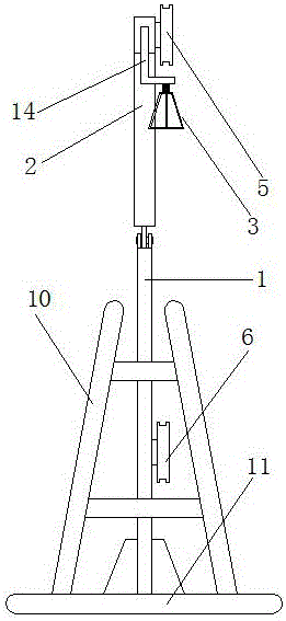参照附图1-2示的一种不锈钢焊丝拉直用上线装置,包括主支架和置料架,所述置料架由底座11和两个置料立柱10组成,两个置料立柱10之间通过连接板连接,并且两个所述置料立柱10均倾斜设置,两个置料立柱10倾斜设置后形成一锥形结构,成捆的焊丝可以较方便的套接在两个置料立柱10上,上料更加方便,所述主支架由竖向支架1和倾斜支架2两部分构成,所述竖向支架1与所述倾斜支架2之间活动连接,在所述竖向支架1上还设有活动板13,倾斜支架2上设有导向板12,导向板12的底部与活动板13铰接,这样能够给倾斜支架2和竖向支架1的连接起到一个导向作用,在所述竖向支架1上设置固定板一8,并在所述倾斜支架2上设置固定板二9,所述固定板一8与所述固定板二9之间连接气缸7,所述倾斜支架2顶端设有导线框3和导线轮一5,在所述竖向支架1上设有导线轮二6。