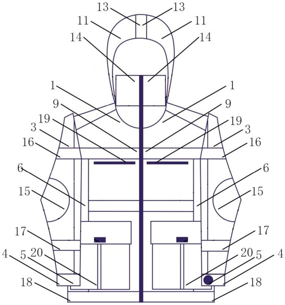19、3、该新型智能监测体温装置的夏季防晒环卫服装,通过在前衣身和后衣身设置第一镂空部和第二镂空部,可有效的提高散热效果,防止穿着人员体温过高。
