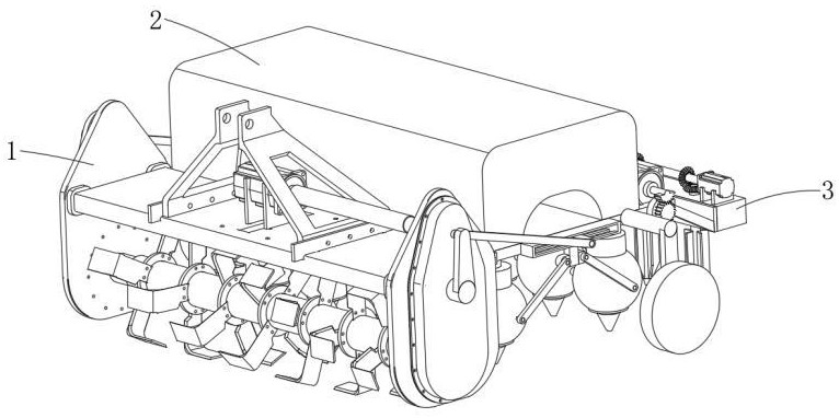 2、为达到以上目的,本发明采用的技术方案为:一种黄河盐碱地生态修复装置,包括破碎土壤用的破土组件与向土壤中加入土壤调理剂的碎土组件,所述碎土组件的后方设置有用于将土地平整的平整组件,所述破土组件包括两组护板,两组所述护板之间固定连接有固定板,两组所述护板之间转动连接有横轴,所述横轴位于固定板的下方,所述横轴的外侧固定连接有安装片,所述安装片的外侧固定连接有破碎刀片,所述固定板的上端固定连接有两组有连接架。